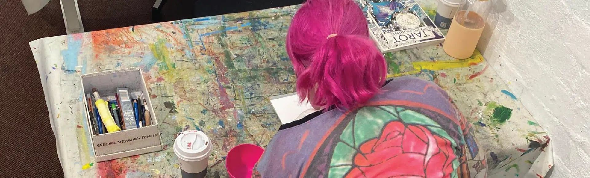 “My mental health can’t hold me back from my art,” says Hannah who attends Boonah Creative Arts Centre. Boonah is an art studio that provides a safe and supported place for artists living with a disability. For Hannah, it is the lack of judgement and creative freedom she experiences at Boonah that keeps her coming back, “I can use pencil, pen, paint or whatever I choose. No one is judging me and that’s a relief. I can be who I want here.”